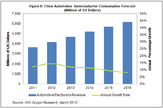 中國(guó)汽車(chē)半導(dǎo)體市場(chǎng)過(guò)去幾年快速增長(zhǎng),2010年中國(guó)汽車(chē)半導(dǎo)體消費(fèi)額銳增58%,達(dá)到32億美元。中國(guó)汽車(chē)需求旺盛,而中國(guó)消費(fèi)者收入增加和政府刺激政策幫助提高了汽車(chē)銷(xiāo)量,這些因素都有利于中國(guó)汽車(chē)電子市場(chǎng)的擴(kuò)張。