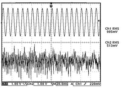 常見的音源,包含樂音和語(yǔ)音,其RMS值往往比峰值輸出功率低得多。通常情況下,語(yǔ)音的峰值與RMS功率之比(即波峰因數(shù))為12dB,而樂音的波峰因數(shù)為 18~20dB。圖1為時(shí)域內(nèi)音頻信號(hào)和正弦波的波形圖,給出了采用示波器測(cè)量?jī)烧逺MS值的結(jié)果。雖然音頻信號(hào)峰值略高于正弦波,但其RMS值大概只有正弦波的一半。同樣,音頻信號(hào)可能存在突變,但正如測(cè)量結(jié)果所示,其平均值仍遠(yuǎn)低于正弦波。雖然音頻信號(hào)可能具有與正弦波相近的峰值,但D類放大器表現(xiàn)出來(lái)的熱效應(yīng)卻大大低于正弦波。因此,測(cè)量系統(tǒng)的熱性能時(shí),最好使用實(shí)際音頻信號(hào)而非正弦波作為信號(hào)源。如果只能使用正弦波,則所得到的熱性能要比實(shí)際系統(tǒng)差。