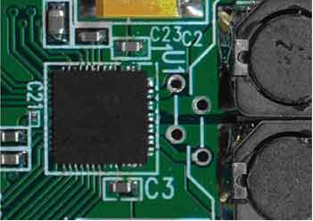 與裸露焊盤相接的敷銅塊應(yīng)該用多個(gè)過(guò)孔連到PCB背面的其他敷銅塊上,并應(yīng)該在滿足系統(tǒng)信號(hào)走線的要求下具有盡可能大的面積。加寬所有與器件的連線,這將有益于改善系統(tǒng)的散熱性能。雖然IC的引腳并不是主要的散熱通道,但實(shí)際應(yīng)用中仍然會(huì)有少量發(fā)熱。圖3所示的PCB中,寬連線將D類放大器的輸出與圖右側(cè)的兩個(gè)電感相連。在這種情況下,電感的銅芯繞線也可為D類放大器提供額外的散熱通道。雖然對(duì)整體熱性能的改善不到10%,但這樣的改善卻會(huì)給系統(tǒng)帶來(lái)兩種截然不同的結(jié)果—系統(tǒng)具備較理想的散熱或出現(xiàn)較嚴(yán)重的發(fā)熱。