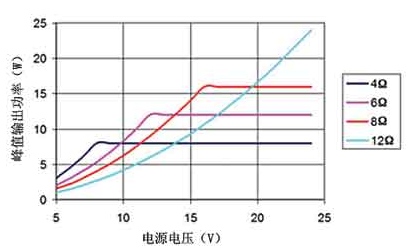 D 類放大器MOSFET輸出級(jí)的導(dǎo)通電阻會(huì)影響它的效率和峰值電流能力。降低負(fù)載的峰值電流可減少M(fèi)OSFET的I2R損耗,進(jìn)而提高效率。要降低峰值電流,應(yīng)在保證輸出功率, D類放大器的電壓擺幅以及電源電壓的限制的條件下,選擇最大阻抗的揚(yáng)聲器,如圖4所示。本例中,假設(shè)D類放大器的輸出電流為2A,電源電壓范圍為 5~24V。電源電壓大于等于8V時(shí),4Ω的負(fù)載電流將達(dá)到2A,相應(yīng)的最大連續(xù)輸出功率為8W。如果8W的輸出功率能滿足要求,則可以考慮使用一個(gè) 12Ω揚(yáng)聲器和15V供電電壓,此時(shí)的峰值電流限制在1.25A,對(duì)應(yīng)的最大連續(xù)輸出功率為9.4W。此外,12Ω負(fù)載的工作效率要比4Ω負(fù)載的高出 10%~15%。實(shí)際效率的提高根據(jù)不同D類放大器而異。雖然大多數(shù)揚(yáng)聲器的阻抗都采用4Ω或8Ω,但也可采用其他阻抗的揚(yáng)聲器實(shí)現(xiàn)更高效的散熱。