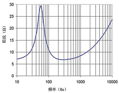 圖5 8Ω阻抗、13cm口徑揚(yáng)聲器的阻抗隨頻率改變而急劇變化