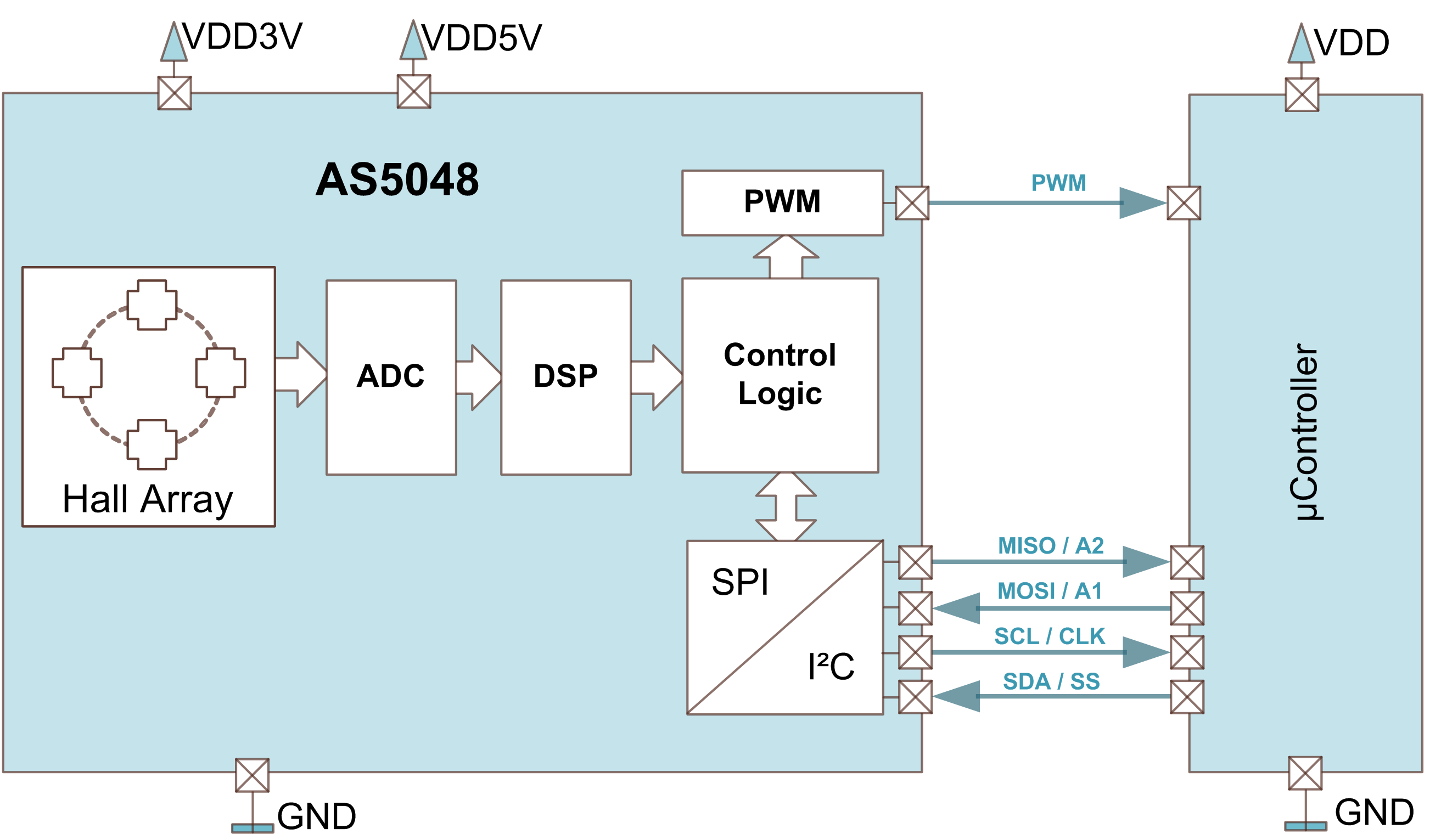 產品所含的內部電壓調壓器使AS5048能在3.3伏或5伏電壓下運作。產品采用14-pin TSSOP封裝。多個器件可以以 菊鏈的方式串接在一起使用。