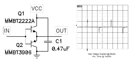 如圖2 hfe曲線所示,通常廠商都不會為這些低電流器件提供高于0.5A的電流。但是,該電路可提供大大高于0.5A的電流驅(qū)動,如圖1中的波形所示。就該波形而言,緩沖器由一個50Ω源驅(qū)動,負(fù)載為一個與1Ω電阻串聯(lián)的0.01 uF電容。該線跡顯示了1Ω電阻兩端的電壓,因此每段接線柱上的電流為2A.該數(shù)字還顯示MMBT2222A可以提供大約3A的電流,MMBT3906吸收2A的電流?! ?br />