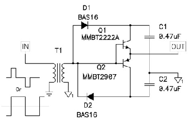 圖1中的示意圖顯示了一個NPN/PNP發(fā)射跟隨器對,其可用于緩沖控制IC的輸出。這可能會增加控制器的驅(qū)動能力并將驅(qū)動損耗轉(zhuǎn)移至外部組件。許多人都認(rèn)為該特殊電路無法提供足夠的驅(qū)動電流?! ?br />