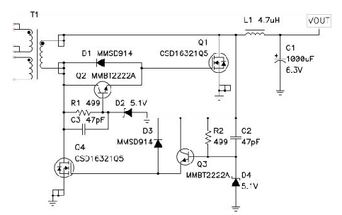 圖 4 顯示的是用于控制同步反向拓?fù)渲?Q2 傳導(dǎo)的分立器件。該電路可以讓您控制開啟柵極電流并保護整流器柵極免受高反向電壓的損壞。該電路可以用變壓器輸出端的負(fù)電壓進(jìn)行驅(qū)動。12V 輸入與 5V 輸出相比負(fù)電壓值很大,從而引起 Q1 傳導(dǎo)并短路電源 FET Q2 上的柵-源電壓,迅速將其關(guān)閉。由于基極電流流經(jīng) R2,因此在加速電容 C1 上就有了一個負(fù)電壓。在此期間,一次側(cè) FET 將會發(fā)生傳導(dǎo)并在變壓器磁化電感中存儲能量。一次側(cè) FET 關(guān)閉時,變壓器輸出電壓在正電壓范圍擺動。Q2 柵-源通過 D1 和 R1 被迅速前向偏置。C1 放電時,D2 對 Q1 基極-發(fā)射極連接進(jìn)行保護。在一次側(cè) FET 再次開啟之前,該電路會一直保持這種狀態(tài)。正如同步降壓轉(zhuǎn)換器那樣,輸出電流會真正地對輸出電容進(jìn)行放電。開啟一次側(cè) FET 會衰減變壓器二次側(cè)上的電壓并去除 Q2 的正驅(qū)動。這種轉(zhuǎn)換會導(dǎo)致明顯的貫通疊加一次側(cè) FET 和 Q2 傳導(dǎo)次數(shù)。為了最小化該次數(shù),當(dāng)一次側(cè)和二次側(cè) FET 均開啟時,Q1 將會盡快地短路同步整流器上的柵-源。