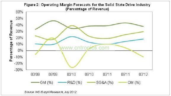 上次SSD產(chǎn)業(yè)出現(xiàn)營(yíng)業(yè)利潤(rùn)普遍為負(fù)的情況是在2010年上半年,與目前的情形類(lèi)似。當(dāng)時(shí),幾家廠商加大銷(xiāo)售力度,以改善略高于35%的毛利率。這些努力取得了一些效果,2011年中期毛利率自2009年以來(lái)首次升到了40%以上。但由于產(chǎn)業(yè)競(jìng)爭(zhēng)加劇和營(yíng)業(yè)費(fèi)用增加,SSD毛利率在2011年第四季度重新跌至40%以下。