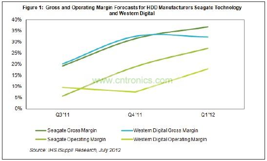 第一季度希捷的毛利率達(dá)到36.9%,高于去年第四季度時(shí)的31.6%,以及去年第三季度時(shí)的19.3%。泰國(guó)洪災(zāi)發(fā)生在去年第三季度。希捷的營(yíng)業(yè)利潤(rùn)率上升幅度更大,從去年第四季度的18.9%跳增至27.2%,如圖1所示。
