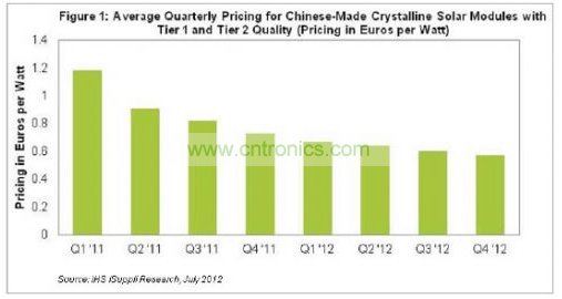 預(yù)計(jì)下半年晶體太陽能模組的平均市場價(jià)格仍將下跌11%,但跌幅略小于上半年的12%,并遠(yuǎn)小于2011年下半年的20%。預(yù)計(jì)2012年第四季度平均市場價(jià)格將從第二季度的每瓦0.64歐元跌至0.57歐元。模組通常以歐元計(jì)價(jià),而硅則以美元計(jì)價(jià)。