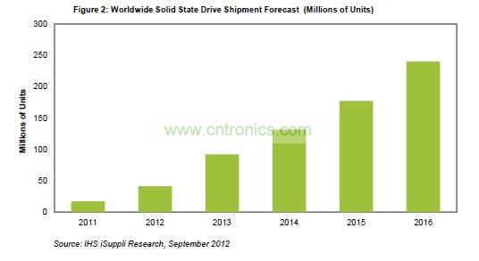 預(yù)計(jì)2013年SSD出貨量將達(dá)到9200萬個,而今年和去年分別是4100萬和1700萬個,如圖所示。明年過后仍將強(qiáng)勁增長,保持兩位數(shù)的速度,直到2016年,屆時預(yù)計(jì)SSD出貨量將達(dá)到2.4億個。