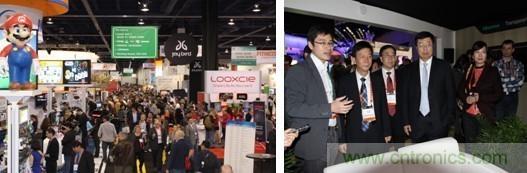 (圖為美國CES展會現(xiàn)場人氣火爆及深圳市平板顯示行業(yè)協(xié)會領(lǐng)導(dǎo)陪同工信部領(lǐng)導(dǎo)一行參觀)