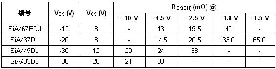 對于電源管理中的負載和電池開關(guān),以及智能手機、平板電腦、移動計算設備、硬盤驅(qū)動器和固態(tài)驅(qū)動的同步降壓轉(zhuǎn)換應用里的控制開關(guān),-12 V SiA467EDJ提供了13m?(-4.5V)的極低導通電阻。-20V SiA437DJ的導通電阻為14.5m?(-4.5V),-30V SiA449DJ和SiA483DJ的導通電阻分別只有20m?(-10V)和21m?(-10V)。另外,SiA437DJ和SiA467EDJ的電流等級高達30A,承受很大的涌入電流,可用于負載開關(guān)。