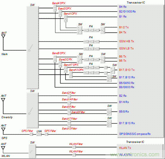 圖2:GSM/UMTS/LTE對應終端的前端配置的示例