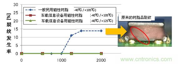 熱沖擊投入周期數(shù)和裂紋發(fā)生率的關(guān)系如圖3所示。一般民用市場的磁性樹脂在1000輪以下就會產(chǎn)生裂紋,而我們開發(fā)的車載信息設(shè)備用磁性樹脂在2000輪之后仍然沒有產(chǎn)生裂紋。并且確保即使在更嚴厲的-40℃⇔+125℃環(huán)境下的熱沖擊試驗中也不會產(chǎn)生裂紋。