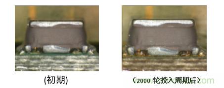 磁性樹脂和鼓芯都沒有看見裂紋產(chǎn)生。另外,電氣特征的變化也控制在±1%以內(nèi)。-40℃⇔+105℃的環(huán)境下外觀上沒有任何的破壞,并且電氣特征保持穩(wěn)定,這使其成為了能夠滿足車載用電子元器件性能要求的產(chǎn)品。