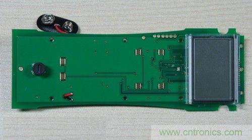 翻轉(zhuǎn)板卡,另一面的電路就更少了,除了一個(gè)段式的LCD模塊,以及幾個(gè)功能按鍵(黑色旋鈕為校準(zhǔn)溫度的變阻器),就沒什么東西了,有意思的是段式LCD模塊與PCB板的連接方式。