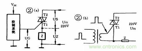 改進此電路的方法之一是,采用觸發(fā)變壓器隔離控制系統(tǒng)的參考點(如圖2b), 觸發(fā)信號可以由BT33組成鋸齒波發(fā)生器受控于控制系統(tǒng)(矩形波也可以),這樣,不受初級參考點的影響,觸發(fā)變壓器次級可直接接在G與T1之間,與負載上電壓無關(guān)。
