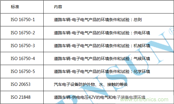 ISO 16750 系列標(biāo)準(zhǔn)是國際標(biāo)準(zhǔn)化組織ISO 最近幾年推出的針對(duì)汽車電子的環(huán)境可靠性標(biāo)準(zhǔn),該標(biāo)準(zhǔn)是歐系車常用的標(biāo)準(zhǔn),并且逐漸被世界各國轉(zhuǎn)化為國家標(biāo)準(zhǔn),也逐漸被各企業(yè)標(biāo)準(zhǔn)所引用,成為應(yīng)用比較廣泛的汽車電子的環(huán)境可靠性標(biāo)準(zhǔn)。該系列標(biāo)準(zhǔn)包括五個(gè)部分:
