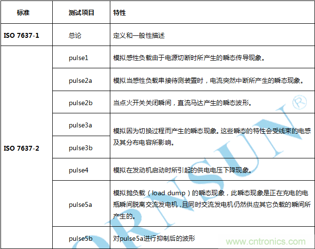 針對(duì)汽車電子自身產(chǎn)生的干擾,國際無線電干擾委員會(huì)(CISPR)對(duì)汽車電子業(yè)提出了嚴(yán)格的要求,尤其是車載收音機(jī)、數(shù)字電視、導(dǎo)航設(shè)備都是這種干擾的重災(zāi)區(qū)。所以 CISPR25:用于保護(hù)車載接收機(jī)的無線電騷擾特性的限值和測試方法,對(duì)汽車電子自身的發(fā)射狀態(tài)也有了明確的等級(jí)判定。EMS方面的測試項(xiàng)目如下所示:
