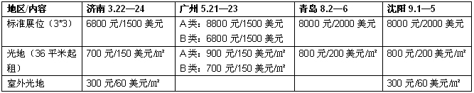 備注:標(biāo)準(zhǔn)展位:包括(3M×3M)展位(三面圍板、楣板、一桌二椅、220V電源插座、照明費(fèi)、清潔費(fèi)等)