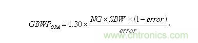 就該電路而言,如果您想要容許放大器 0.05 的增益誤差,同時(shí)您知道因產(chǎn)品和溫度的不同,放大器的 GBWP 會(huì)改變 30% 最大值,則您需要一個(gè)具有 247 MHz GBWP 的放大器。產(chǎn)品選擇部分的指導(dǎo)公式如下: