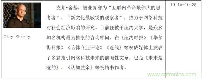 本次創(chuàng)客論壇三天共三個主題:啟蒙創(chuàng)新、創(chuàng)客本質和協(xié)同合作,將邀請到包括暢銷書《失控》作者Kevin Kelly、克萊舍基、Arduino開源電子原型開發(fā)平臺聯(lián)合創(chuàng)始人Massimo Banzi、第一個生物創(chuàng)客空間BioCurious聯(lián)合創(chuàng)始人Tito Jankonski、F.laobo的制作人和ArduinoFio的設計者Shigeru Kobayashi、Intel最小的實習生Joey Hudy和為麻省理工研究生授課的14歲電子神童QuinEtnyre等等共50余位來自全世界各地的創(chuàng)新領域領軍人物。