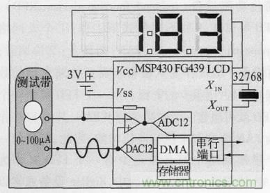 醫(yī)療傳感器節(jié)點(diǎn)框圖如圖2 所示,主要包括醫(yī)療傳感器模塊、ZigBee 通信模塊、處理器單元和電源4 部分。處理器單元如圖3 所示,主要分為CPU、存儲(chǔ)器、AD 轉(zhuǎn)換、測(cè)試帶和數(shù)碼顯示屏5 部分。根據(jù)低功耗和處理能力的需要,采用TI公司的MSP430 系列單片機(jī),存儲(chǔ)器部分主要用于存儲(chǔ)傳感器所采集的臨時(shí)數(shù)據(jù),在處理器將數(shù)據(jù)傳輸之后,傳感器節(jié)點(diǎn)內(nèi)不做數(shù)據(jù)的大量存儲(chǔ)。