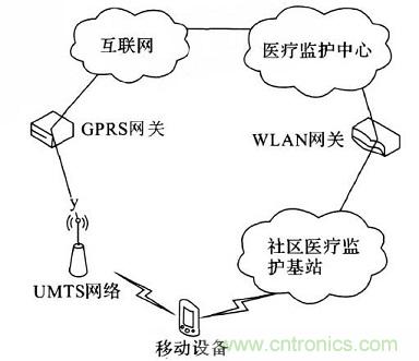 系統(tǒng)中包括無線個(gè)人網(wǎng)絡(luò)(wireless person2al area network,WPAN ) 、ZigBee網(wǎng)絡(luò)以及一系列醫(yī)療監(jiān)護(hù)網(wǎng)絡(luò)的醫(yī)療傳感器節(jié)點(diǎn)。本系統(tǒng)具有良好的擴(kuò)展性,例如醫(yī)護(hù)人員在急救途中或在其他醫(yī)院可以分別利用WLAN /UMTS網(wǎng)關(guān)和互聯(lián)網(wǎng)與系統(tǒng)進(jìn)行信息交互。