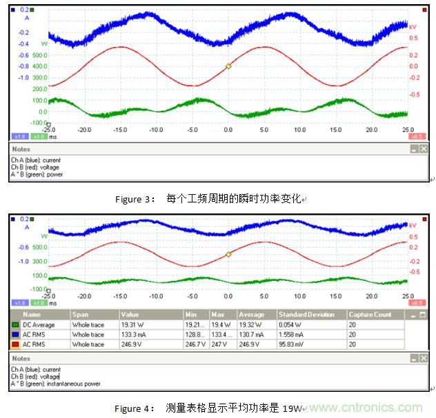 PR=19.32W,視在功率PA也是很容易計(jì)算的。它是由產(chǎn)品電流和電壓的RMS值來(lái)計(jì)算的。PA=0.1307A×246.9V≈32.27 W