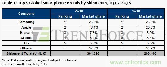 【導(dǎo)讀】近日,市場(chǎng)研究機(jī)構(gòu)TrendForce發(fā)布2015年度第二季度全球智能手機(jī)報(bào)告。中國(guó)的華為明顯獨(dú)領(lǐng)風(fēng)騷。數(shù)據(jù)顯示,三星雖然從蘋(píng)果手里奪回第一的寶座,但是,Q1和Q2 幾乎毫無(wú)變化。蘋(píng)果的市場(chǎng)份額則一調(diào)再掉,從Q1的20.5%掉到Q2的15.4%。華為的市場(chǎng)份額增加了7%,小米的份額增加了5%。