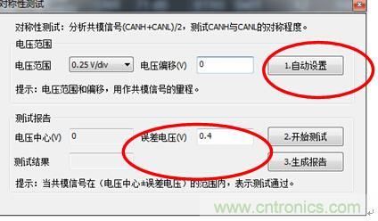 注意:由于GMW3122規(guī)定CANH+CANL的電壓要在4.2V~5.8V,而正常為5V。所以在采用對稱性測試時(shí),其中使用的是(CANH+CANL)/2進(jìn)行判別。 所以標(biāo)準(zhǔn)范圍為2.1V~2.9V,正常為2.5V。因此圖7中誤差電壓需要填入0.4。
