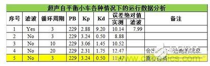 誤差絕對值是指小車在一段時間內(nèi),實測距離與設(shè)定平衡點距離誤差絕對值的平均值;濾波是指程序中對超聲波測量的距離濾波或不濾波直接使用;循環(huán)周期是程序中的延時時間,超聲波測量需要大約704us,一個周期大約為3.84ms,程序處理時間大約為136us.