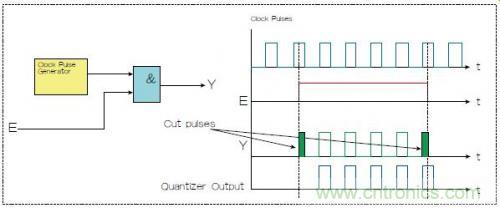 圖1:兩種選通脈沖串的方法,一種是使用選通信號(hào)E和與門(mén)(Y輸出),一種是量化器(藍(lán)色)。