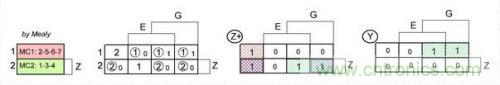 現(xiàn)在就很容易畫(huà)出壓縮的狀態(tài)轉(zhuǎn)換表,并為Z編碼的內(nèi)存單元和輸出選通信號(hào)Y畫(huà)出卡諾-維奇圖(圖4)。