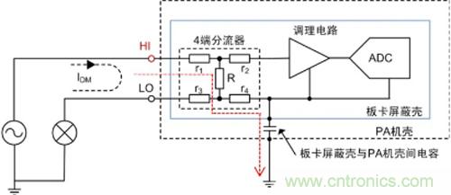 3.電流通道接入高端和低端,測量結(jié)果也不同,內(nèi)部板卡屏蔽殼與機殼間多少都會存在一些雜散電容(空間中兩個絕緣導體中存在電容),若電流通道接入高端,產(chǎn)生泄漏電流(圖3中紅色標記線),因此電流測量輸入應當串在共模電壓較低的地方(低端)。