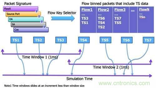 某些情況下,可能需要數(shù)百萬(wàn)個(gè)資料包才能切中當(dāng)前設(shè)計(jì)中穩(wěn)態(tài)分析的重點(diǎn)。以測(cè)量兆百萬(wàn)位元組乙太網(wǎng)交換機(jī)的流量位元速率為例。采用虛擬乙太網(wǎng)簽名生成和封包時(shí)間戳記(TS)來(lái)計(jì)算這些數(shù)據(jù)。