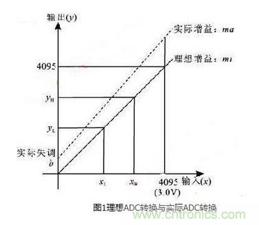 對于雙極性輸入,其0 V輸入的增益誤差對應單極性輸入的1.4315V的增益誤差,因此,原有ADC的增益誤差和失調(diào)誤差被增大了。例如,如果ADC的增益誤差為5%,失調(diào)誤差為2%,則其雙極性的增益誤差計算如下:雙極性輸入x′= 0.0000 V,單極性的ADC輸入電壓x = 1.4315 V,其理想的轉(zhuǎn)換值為ye=1.4315×4095/3=1954,而由ya=1954×1.05+80計算得實際轉(zhuǎn)換值,則雙極性增益誤差為ya-ye=2132-1954=178(9.1%誤差)。通過計算可以看出,ADC的誤差大大增加,因此要使用ADC進行數(shù)據(jù)采集,就必須對ADC進行校正,提高其轉(zhuǎn)換精度。