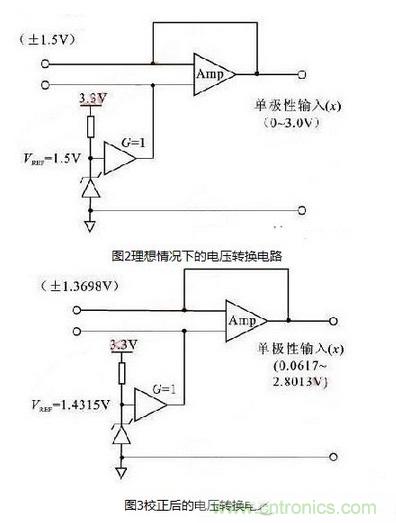在實際應用中,所采集的信號經(jīng)常為雙極型信號,因此信號在送至ADC之前需要添加轉(zhuǎn)換電路,將雙極型信號轉(zhuǎn)化為單極型信號。典型的轉(zhuǎn)換電路如圖2所示。對于ADC模塊,考慮到增益誤差和失調(diào)誤差對輸入范圍的影響,轉(zhuǎn)換電路需要調(diào)整為如圖3所示的電路。在圖3中,輸入增益誤差的參考范圍已經(jīng)改變。