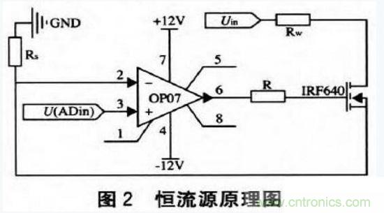 通過16位高精度模數(shù)轉(zhuǎn)換器ADSlll5輸出電壓給恒流源電壓轉(zhuǎn)換恒定電流電路,由于運算放大器OP07是精度高、低漂移運算放大器,并且在10歐負載的情況下輸出電流能達到2 A。所以采用OP07和IRF640組成的一個Uin。電流串聯(lián)負反饋來實現(xiàn)電壓到電流的轉(zhuǎn)換,具體電路如圖2所示。