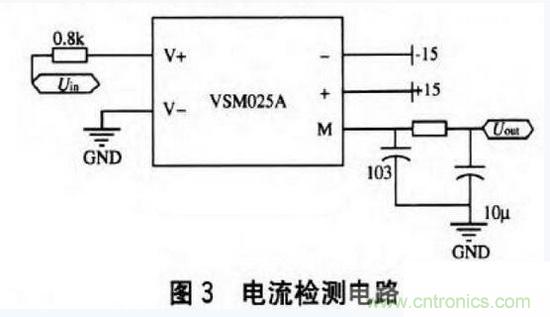 系統(tǒng)所要檢測的信號采用霍爾傳感器法檢測,如被測電源設(shè)備向該簡易直流電子負載輸入的電壓,以及流進負載的電流。電壓和電流檢測分別通過電壓霍爾、電流霍爾傳感器檢測,并經(jīng)過必要的輸出轉(zhuǎn)換電路后轉(zhuǎn)換為檢測信號。為了提高系統(tǒng)的抗干擾性,檢測信號經(jīng)過一個低通濾波器濾除噪聲,再送入單片機的AD轉(zhuǎn)換器中。其中電流霍爾的原理圖如3所示。