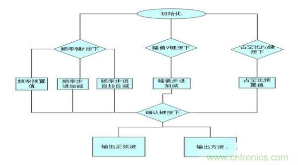 單片機控制AD9851產(chǎn)生頻率和相位都可控的正弦波,頻率量由鍵盤設(shè)定,步進(jìn)量為5Hz,AD9851頻率分辨率為0.006985Hz,完全能夠滿足要求。正弦信號送入DAC8831的基準(zhǔn)輸入端,單片機控制DA的數(shù)字量調(diào)節(jié)其幅值,設(shè)置按鍵調(diào)整幅值可實現(xiàn)100mv的步進(jìn)。在單片機的控制下編程在FPGA內(nèi)部產(chǎn)生占空比可調(diào)的脈沖波,單片機向FPGA送入占空比值和頻率值,F(xiàn)PGA通過計數(shù)值從而改變輸出脈沖波的占空比和頻率,設(shè)置按鍵調(diào)整占空比和幅值。正弦信號送入DAC8831的基準(zhǔn)輸入端,單片機控制DA的數(shù)字量調(diào)節(jié)其幅值,設(shè)置按鍵調(diào)整幅值可實現(xiàn)100mv的步進(jìn)。