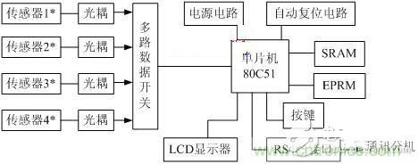 壓力測量控制系統(tǒng)的結(jié)構(gòu)如圖1所示, 它以80C51單片機(jī)為核心, 包括傳感器、光耦、多路數(shù)據(jù)開關(guān)、LCD液晶顯示器、SRAM, EPROM、自動(dòng)復(fù)位電路、RS-485接口電路及高效電源電路等。下面分別介紹一下它們各自的設(shè)計(jì)特點(diǎn)。
