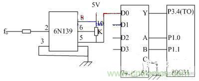 由圖2看出,傳感器頻率信號(hào)是通過光電耦合器6N139耦合到74HC151的輸入引腳D0。80C51的P1.0, P1.1輸出控制碼,選擇D0--D3輸入中的一路,用單片機(jī)的T0測信號(hào)頻率。