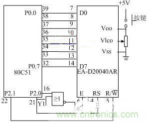 LCM點(diǎn)陣式液晶顯示模塊能顯示的字符多,并且能顯示漢字,因而在智能化測量控制儀表中得到了廣泛的應(yīng)用。本系統(tǒng)選用的是EPSON公司生產(chǎn)的EA-D20040AR點(diǎn)陣式液晶顯示模塊,它由TN型液晶顯示器、CMOS驅(qū)動(dòng)器和CMOS控制器組成,模塊內(nèi)集成有字符發(fā)生器和數(shù)據(jù)存貯器,采用單±5V電源供電,內(nèi)部有能顯示96個(gè)ASCII字符和92個(gè)特殊字符的字庫。EA-D20040AR與單片機(jī)80C51的接口電路如圖4所示: