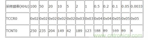 ADC的采樣頻率在上文已有提及,ADC中斷的計算公式為:,通過ATmega16的特殊功能寄存器TCCR0的低3位CS02,CS01,CS00的設(shè)置就可以改變的頻率,再把TCNT0設(shè)置成不同的數(shù)值就可以得到這個系統(tǒng)所需要的各個采樣頻率值了。表1中的數(shù)據(jù)是通過上面的公式計算出來的數(shù)據(jù)再經(jīng)實際的系統(tǒng)調(diào)試并修正后的數(shù)據(jù)。