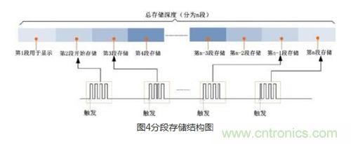 原理如下圖所示:總的存儲深度分為n段,第1段用于顯示,第2段開始存儲,也就是當發(fā)生第一次觸發(fā)時采集的數(shù)據(jù)存儲到第2段存儲空間中,當?shù)?段存儲空間存儲滿之后,結束第一次觸發(fā),等待第二次觸發(fā)的到來,觸發(fā)后把數(shù)據(jù)存儲到第3段存儲空間中,以此類推。