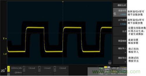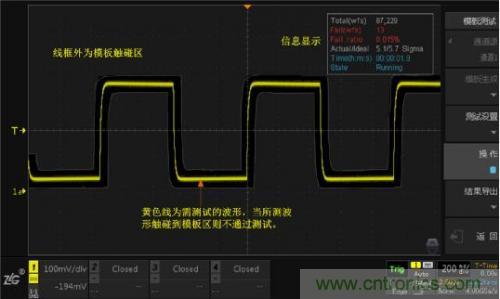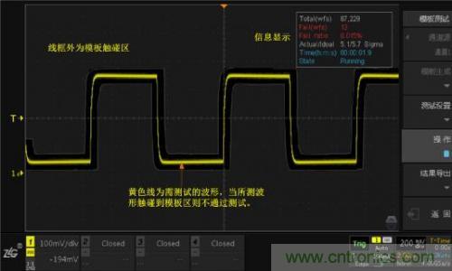 上圖就是模板測(cè)試的測(cè)試界面,其中,線框外為模板觸碰區(qū),波形接觸到該區(qū)域會(huì)被判定為不合格波形,即“Fail”。沒(méi)有接觸到模板觸碰區(qū)的波形為“Pass”。右上角顯示信息是模板測(cè)試中的一些狀態(tài)信息。