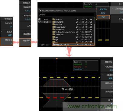 當(dāng)原始波形沒(méi)辦法滿足我們對(duì)波形的限制時(shí),用戶(hù)還可將儀器內(nèi)部Flash存儲(chǔ)器或外部U盤(pán)中存儲(chǔ)的測(cè)試模板文件導(dǎo)入,導(dǎo)入的波形可以是以前保存的*.msk文件或者是自行設(shè)置的*.txt文件。