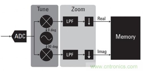 數(shù)字化儀采用諸如零抑制(zero suppress)等數(shù)據(jù)壓縮技術(shù),只保留超過(guò)給定閾值的相關(guān)信號(hào)。它們還使用數(shù)據(jù)打包和四舍五入來(lái)優(yōu)化可用存儲(chǔ)器空間。也使用諸如數(shù)字下變頻(DDC)等實(shí)時(shí)數(shù)據(jù)壓縮技術(shù)。DDC 直接在 ADC 數(shù)據(jù)上進(jìn)行數(shù)據(jù)的頻率轉(zhuǎn)換和抽取。圖 3 中的框圖顯示了其基本原理。捕獲到復(fù)雜的 IQ 數(shù)據(jù),可以使中心頻率下變頻到 0 Hz。然后使用濾波和數(shù)據(jù)抽取來(lái)去除不需要的頻率分量,縮減所需數(shù)據(jù)的大小。在對(duì)寬帶采集中的一小段頻譜進(jìn)行分析時(shí),DDC 非常有價(jià)值。DDC 不僅可以減少所需的存儲(chǔ)空間,而且可以降低寬帶綜合噪聲,改善整體信噪比(SNR)。