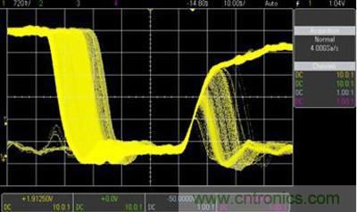 圖 4. 示波器具有超過(guò)每秒 1,000,000 個(gè)波形的更新速率,讓用戶可以看到意外事件和毛刺。