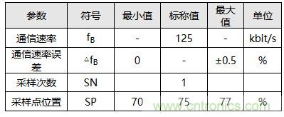 例如某著名車廠CAN通信標(biāo)準(zhǔn)里規(guī)定,通信速率為125 kbps時(shí),應(yīng)該采用單次采樣,采樣點(diǎn)位置設(shè)置在70%~77%之間。其位定時(shí)參數(shù)取值可見表1與表2。